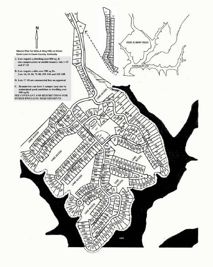 Hide-A-Way Hills is located just outside of Owenton, Kentucky, the county seat of Owen County. Elmer Davis Lake and Hide-A-Way Hills are not far from the Kentucky River. Owenton's location in the exact center of the triangle formed by Cincinnati, Lexington, and Louisville make it an ideal escape both because it is in the best kind of 'middle of nowhere' but also conveniently close to three major urban centers (about 1 hour to all three by car). See map at right showing Hide-A-Way Hills' location in the region, as well as the Association map.